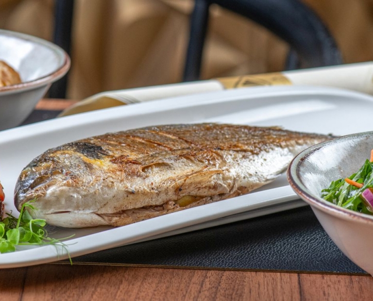 Durbincs egészben sütve, mandulás burgonya, kevert saláta, zöldfűszeres paradicsomgluténmentes | 7 350 Ft | 4, 7, 10 |